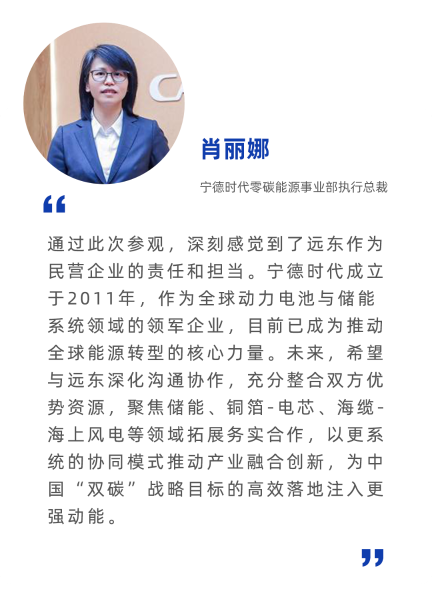 近日,寧德時代新能源科技股份有限公司(以下簡稱“寧德時代”)零碳能源事業(yè)部執(zhí)行總裁肖麗娜率隊來訪遠東參觀交流,遠東控股集團創(chuàng)始人、董事局主席蔣錫培,集團黨委書記、董事局執(zhí)行主席、首席執(zhí)行官蔣承志熱情接待并座談。